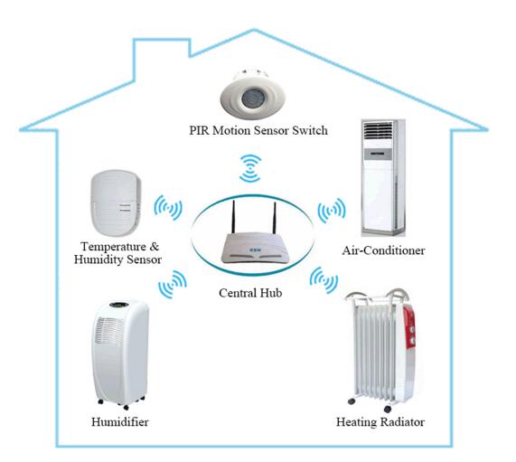 The central control hub in a home automation system plays a very important role. It collects information about a home environment or a building environment, such as temperature, humidity, occupancy, etc., it monitors the status of home appliances, it processes the collected information, and it sends control commands to home appliance such as air conditioner, humidifier, etc.
